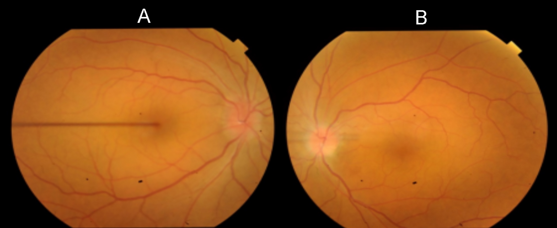 A 37-year male presented to the Mughal Eye Hospital, Lahore, Pakistan, with a one-day history of frequent, painless blurring of vision in both eyes, accompanied by the perception of a horizontal black line. He had no comorbidities, and his medical, surgical, ocular, and trauma history was unremarkable. There was no significant history of allergies or prior medicine use.