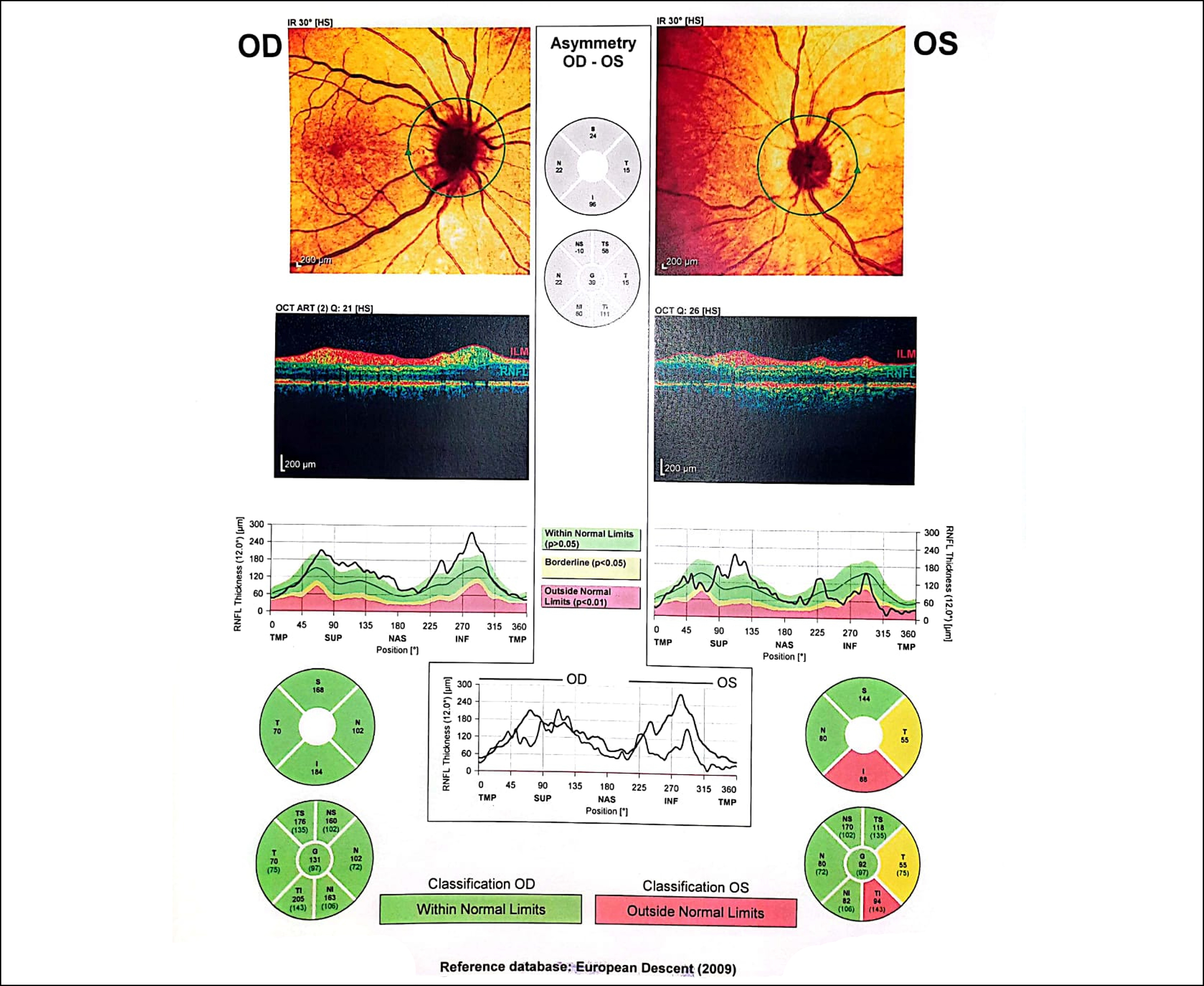 Figure 2: Optical coherence tomography (OCT) of the retinal nerve fibre layer (RNFL) showing retinal thickening suggestive of papilledema in the right eye and RNFL thinning in the left eye.