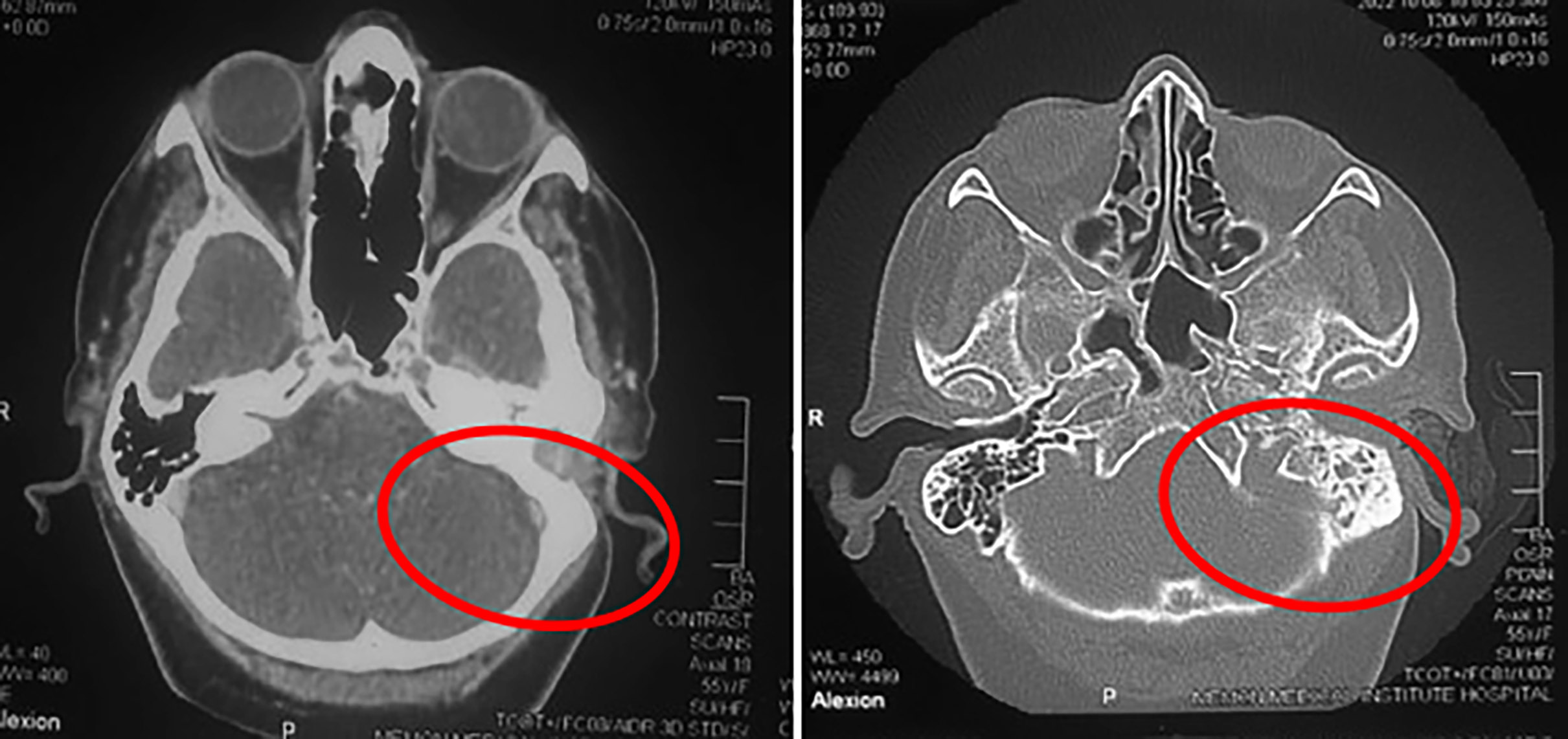 Figure 1: CT scan of temporal bone with contrast (axial view). Right: Red outlined circle shows soft tissue mass occupying left external auditory canal and middle ear cavity with erosion of ossicles; left: Mastoid air cells are sclerotic.