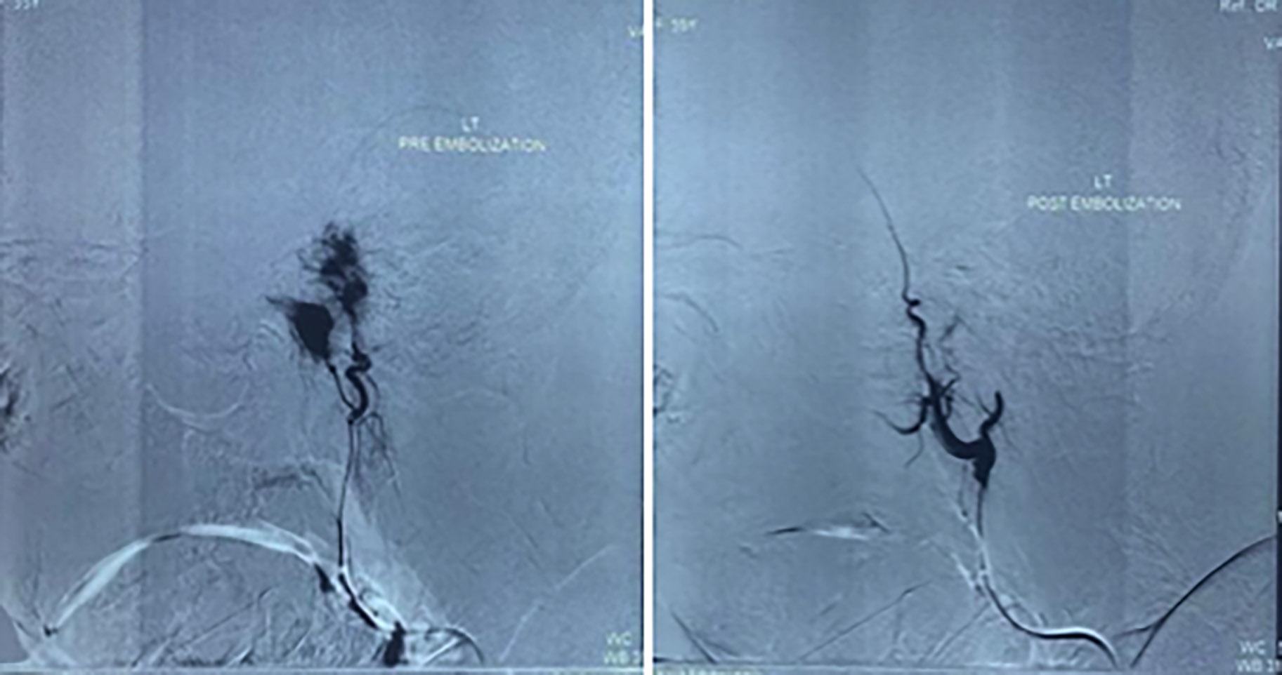 Figure 2: Pre-embolisation angiogram (left) identifying left ascending pharyngeal and posterior auricular arteries as the main feeding vessels. Post-embolisation angiogram (right) shows no flushing.
