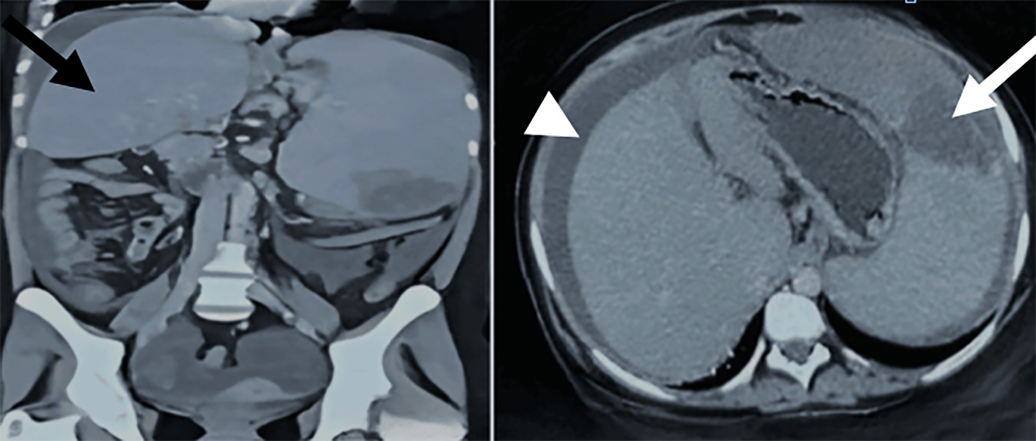 Figure 1: Contrast-enhanced CT of abdomen. Left-coronal section - healthy liver tissue (black arrow). Right-transverse section-wedged shaped area of infarction in the spleen (white arrow) and ascites (white arrow head).