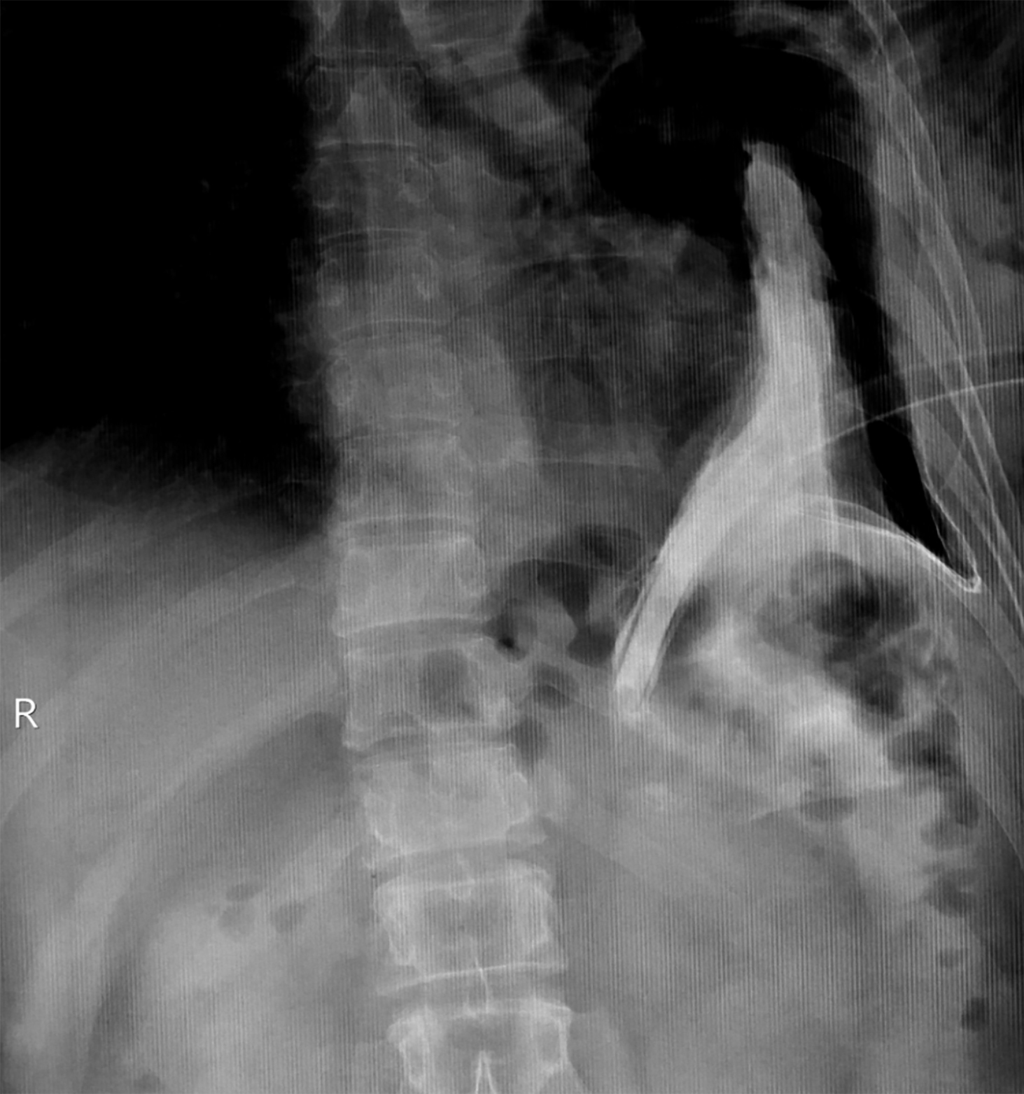 The defect was repaired surgically via laparotomy. Primary repair of rupture of gastric fundus and diaphragm was performed along with establishment of feeding jejunostomy and continued pleural drainage. Postoperative trajectory was smooth. Postoperative barium swallow was performed, which revealed resolution of fistulous communication and normal opacification of the stomach (Figure 3). Patient was discharged 10 days later. He was recovered completely with no sequelae.
