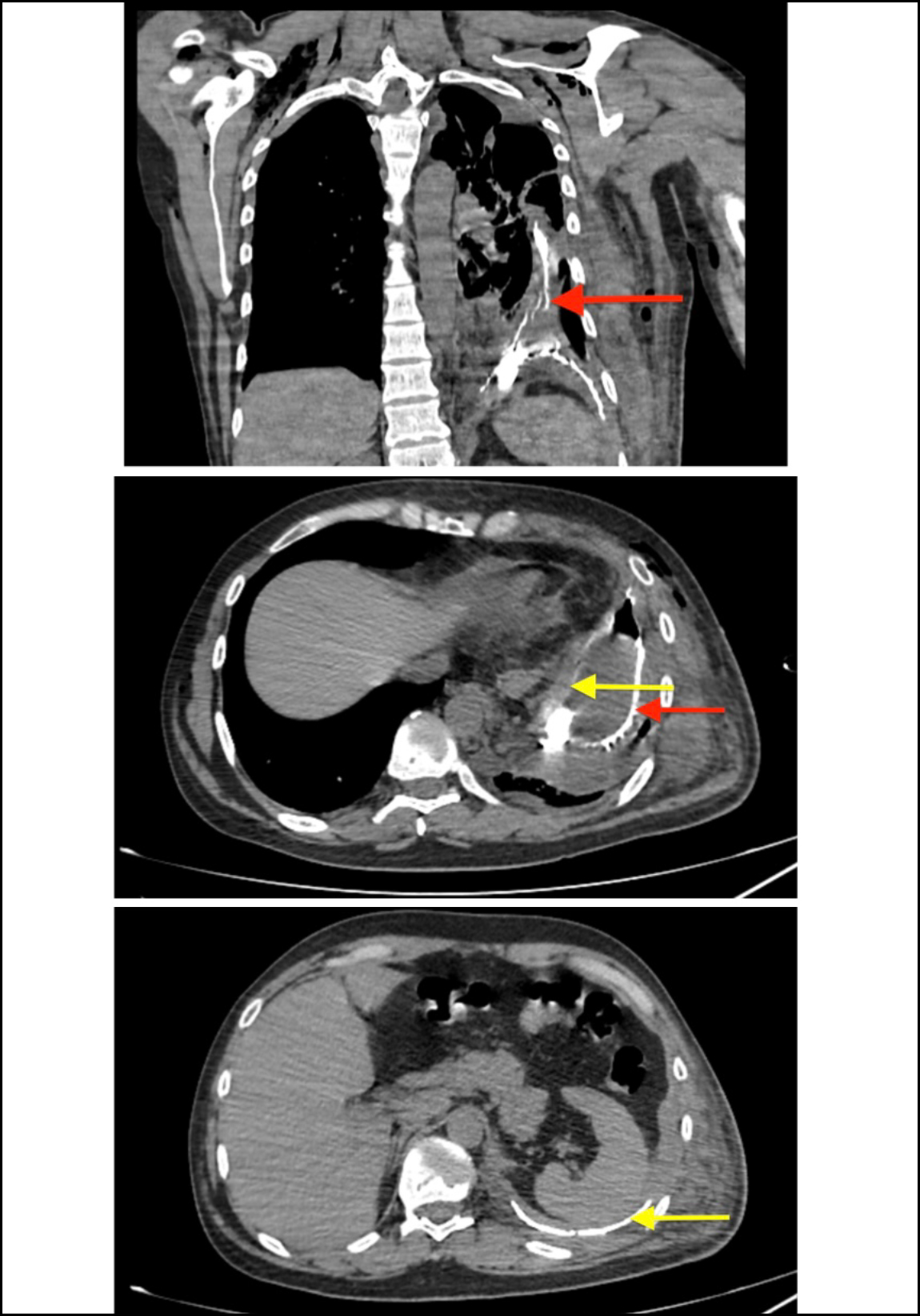 Figure 2: Preoperative CT with oral contrast only: coronal and axial CT demonstrated oral contrast in pleural space (red arrow), identification of a diaphragmatic defect (yellow arrow) with associated herniation of the stomach into pleural space, consistent with gastropleural fistula.