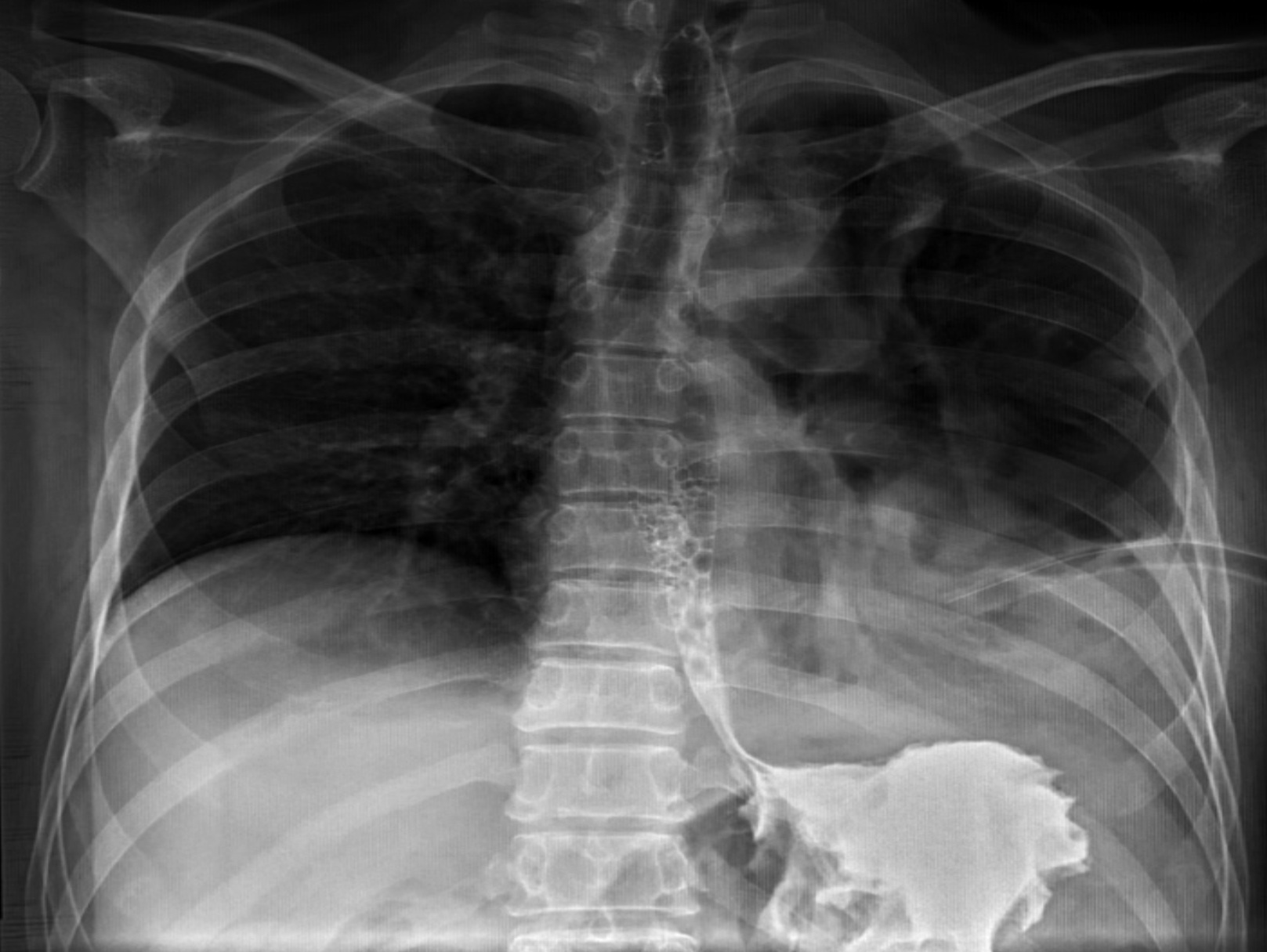 Figure 1: Preoperative barium swallow demonstrating contrast leakage from the stomach into the subdiaphragmatic space and pleural cavity.